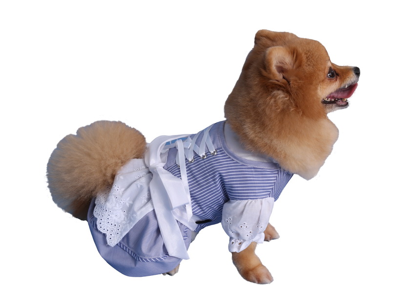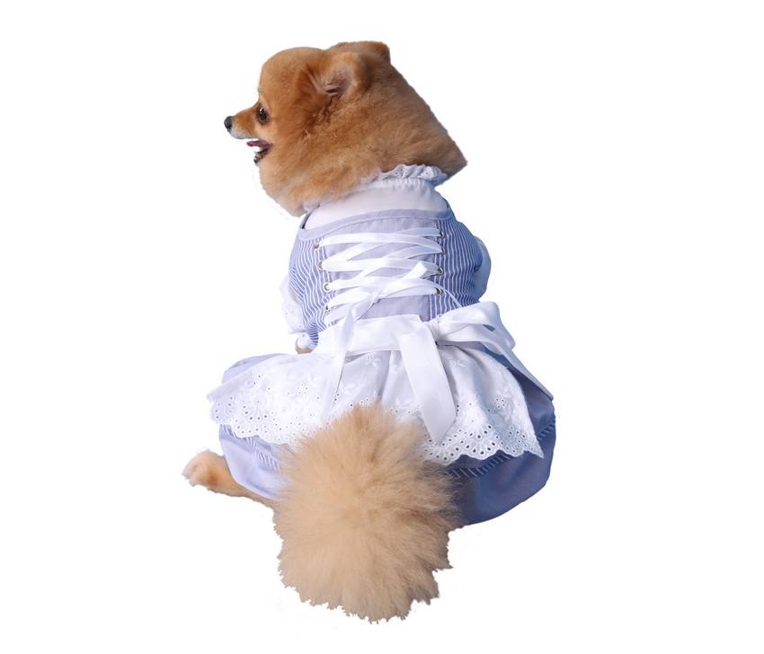 Das niedliche Hundedirndl von Doggydolly ist blau-weiß gestreift, wie es sich für ein ordenliches Trachtenkleid gehört. Im Oberteil des Kleides ist eine weiße Bluse mit verspielter Spitze und Puffärmelchen eingenäht. Am Rücken wird das Hundekleid mit weißen satinierten Bändern im Corsage-Look gekreuzt geschnürt. Der Rock des Kleides ist hellblau und an der Taille mit einer Schleife verziert. Natürlich darf bei dem originellen Dirndl auch die klassische weiße Schürze nicht fehlen.